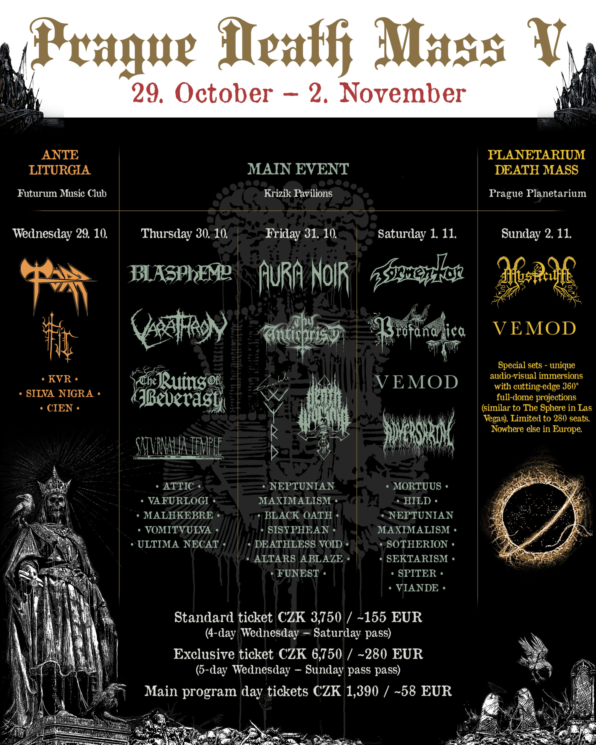 V nedeľu 2. novembra vyvrcholí festival unikátnym vystúpením v Planetáriu Praha, kde sa spojí špičková 8K LED technológia s 360° projekciou a nórsky black metal. MYSTICUM predvedú svoj špecifický industriálny black metal s pulzujúcimi vizuálmi. VEMOD odohrajú druhý festivalový set, navrhnutý špeciálne pre Planetárium – meditativny a kozmický zážitok, ktorý presahuje hranice tradičného koncertného formátu. Tento záverečný ceremoniál predstavuje európske prvenstvo v prezentácii black metalu – spojenie undergroundovej hudby a najmodernejšej vizuálnej technológie v jedinečnom a neopakovateľnom duchu.