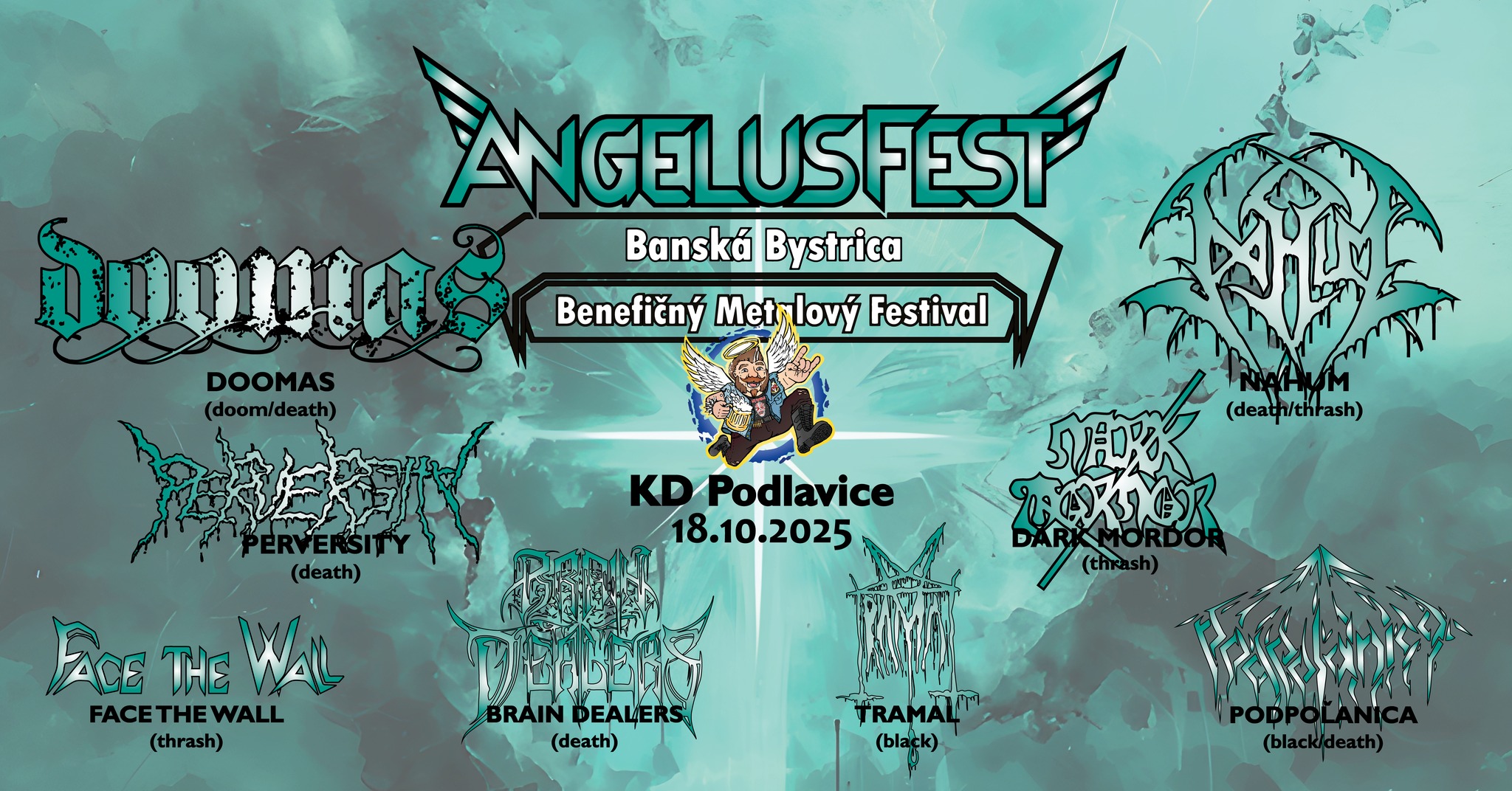 Benefičný metalový koncert Angelus Fest sa už nezadržateľne blíži – v sobotu 18.10. sa v podlavickom kulturáku predstaví fanúšikom 8 kapiel na čele s NAHUM, DOOMAS a PERVERSITY. V spolupráci s organizátormi festu sme pre vás pripravili vedomostno-zábavnú súťaž s možnosťou vyhrať zaujímavé vecné ceny od vystupujúcich kapiel. Súťaž bude mať dve kolá, v každom z nich bude potrebné odpovedať na 4 nenáročné otázky a odpovede poslať na mail info@angelusfest.com. V každom kole budú vyžrebovaní po 2 výhercovia, ktorí si budú môcť vyzdvihnúť svoje ceny priamo na koncerte.