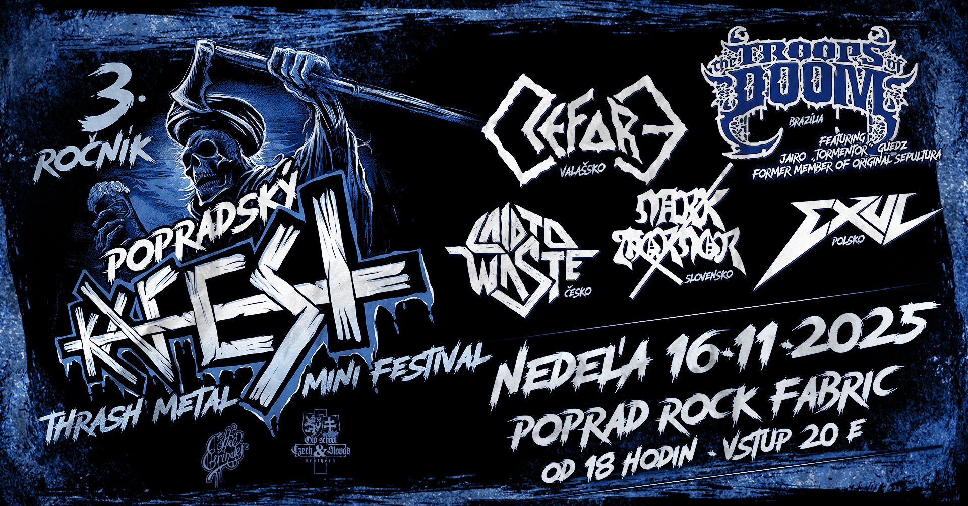 Viete, čo zvyknú hovoriť nemeckí Destruction? Thrash till Death. Tieto tri slovíčka asi najviac definujú to, čo sa bude takto o týždeň v nedeľu 16. novembra (áno je to nedeľa, ale v pondelok malo byť voľno, len žiaľ, veď viete…) odohrávať v popradskom klube Rock Fabric. Hudobný štýl, ktorý podľa mnohých „rádoby“ odborníkov mal mať svoju životnosť na konci niekedy na prelome ôsmej a deviatej dekády minulého storočia. A ejhle. Thrash metal je stále tu a buší do ušných bubienkov silou baranidla. Popradské thrash metalové „meníčko“ o piatich