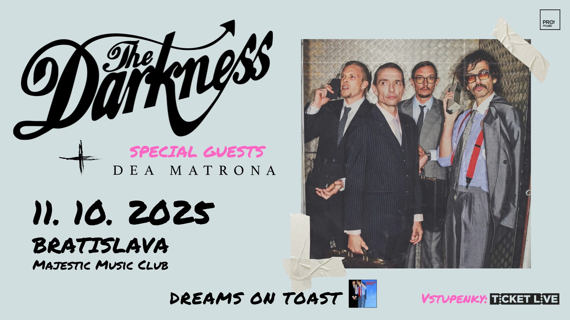 The Darkness, britská glam rocková senzácia, sa po takmer 10 rokoch vracia na Slovensko a odohrá koncert v bratislavskom Majestic Music Clube. Pripravte sa na večer plný energických hitov a živelnej rockovej šou už 11. októbra 2025. The Darkness prinesú nielen svoje nesmrteľné hity, ako „I Believe in a Thing Called Love“, či „Love is Only a Feeling“ ale predstavia aj skladby z nového albumu Dreams on Toast, ktoré ukazujú, že táto kapela stále tvorí a ovláda glam rockovú scénu svojím nespútaným štýlom.