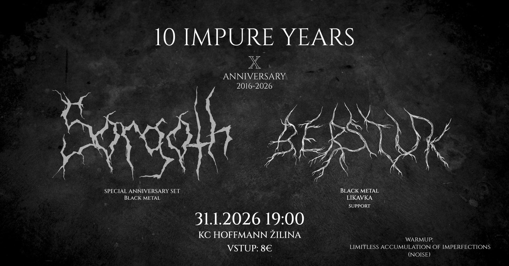 Večer otvorí noise sólo projekt Adama Holáša, LIMITLESS ACCUMULATION OF IMPERFECTIONS. Experimentálna záležitosť, ktorú si netreba nechať ujsť. Sme nesmierne radi, že nám ako support na tento výnimočný moment prídu zahrať naši priatelia z BERSTUK. Táto kapela, pôvodne one man projekt, má na konte demo "Vláda rukou smrti" a debutový album "Keď korene vyrašia". Momentálne […]